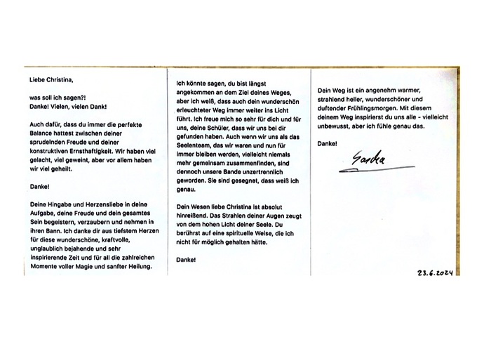 Was wir bei Dir bekommen ist unbezahlbar. Der Sonntag war für mich ein Abschluss des Prozesses. Ich habe Angst vor Männern verlassen zu werden und es alleine nicht zu schaffen. Zum ersten Mal kann ich gefühlt einen Strich unter meine Ehe machen und es klappt immer besser Volker in Ruhe zu lassen und mich um mich selber zu kümmern. Fühle mich um einige Kilos leichter. Es war total schön mit den anderen Frauen und hat mir gezeigt, wie wichtig es ist, dass wir uns gegenseitig unterstützen. Alles Liebe Martina